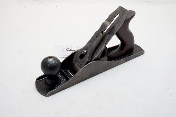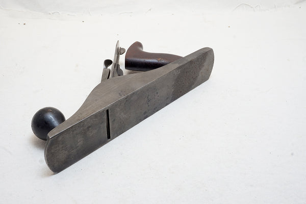 WW II variation with hard plastic frog adjusting nut. Fine condition except for an area of heavy pitting near the back of the sole. A light lap to smooth it over and it will be a great worker. Factory milling lines on all 3 sides. Great size for younger woodworkers. Very nice overall condition with 95%+ japanning.