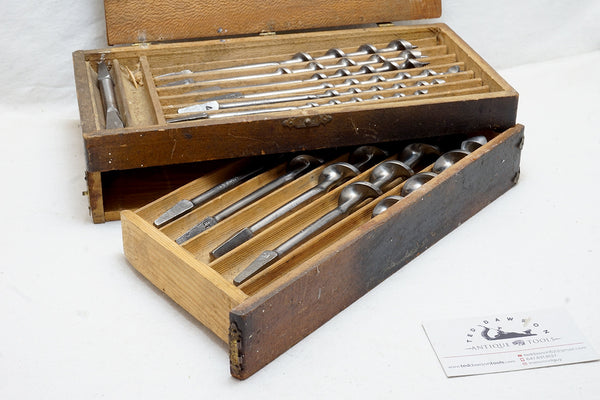 Very early box with the bottom 'drawer'. Complete set of bits #s 4-16 plus screwdriver bit. Fine, little used, uncleaned as found condition. Box needs a bit of TLC missing one 'breadboard' end. #9 bit is unmarked but every other is stamped Irwin as found.