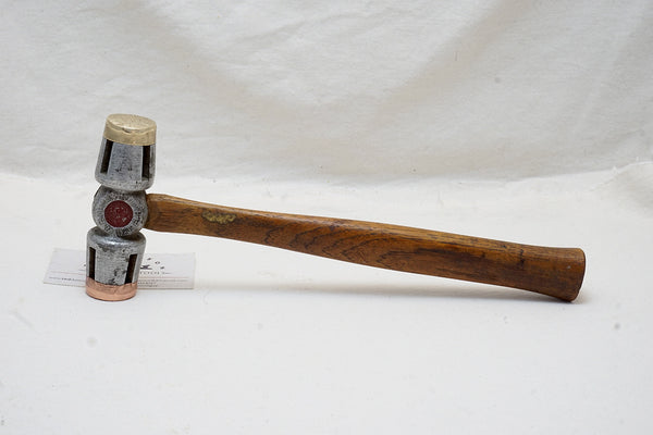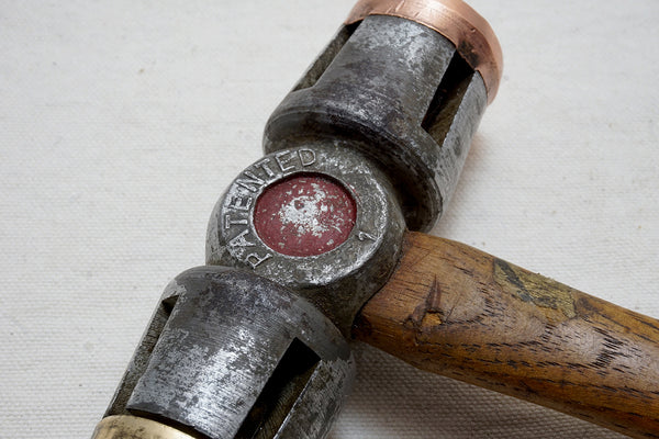Rare hammer as I could find absolutely no reference to or image of it online and just one obscure reference to LEM CO. Wonderful look with the original copper and brass inserts and the shapely head itself. Remnants of an original label on the handle. Lightly cleaned and the copper and brass were peened over so I gently filed them back. A beauty.