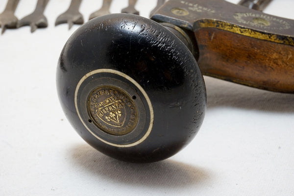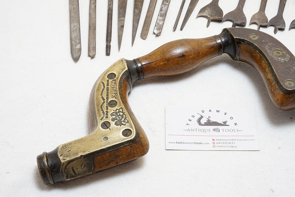 Ca 1880. Much less common than the standard ebony Ultimatum. Just the second I have owned. Fine uncleaned as found condition. Full ring in head. Chuck is fully functional. Wood is excellent. Screw heads are undamaged. Just a few dings in the chuck area and two short tight checks in the wood center section. This is an excellent example which will look stunning with a cleaning. 28 bits found with it are included. Two of them I have never seen before which are thread taps...