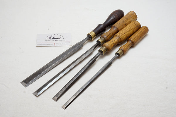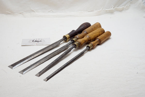 Very nice overall condition and found together. One handle is rosewood. One chisel is on a skew off the handle and will need to be pulled out and reset straight. A few touches of pitting here and there but a really good lifetime set of paring chisels. Includes the following sizes: