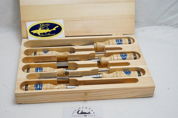 1/4", 3/8", 1/2", 3/4", 1", 1 1/4". Chisels are in excellent condition with brand new perfect reproduction Karelian wild grain birch handles and labels and are housed in a perfect reproduction Berg box. 4 are marked 1026. New large label included.