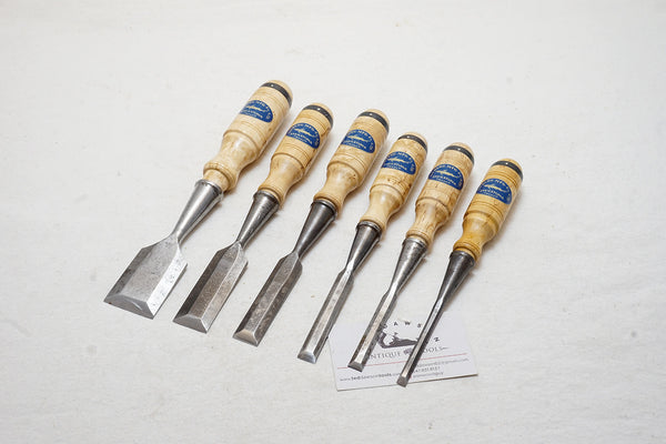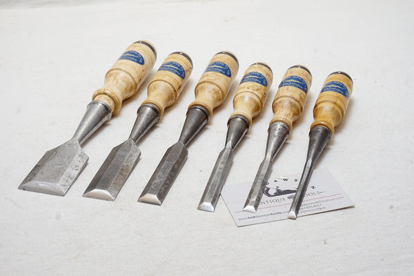 Beautiful set with new perfect reproduction Karelian birch handles and labels. Includes the following sizes: 1/4", 3/8", 1/2", 3/4", 1", 1 1/2"