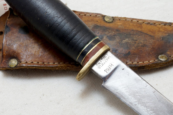8 1/2" in total length. Stacked leather handle. A nice looking knife with leather sheath. Stamped 'PREMIER LIFE TIME' and 'SHEFFIELD ENGLAND H82'. Snap intact but leather needs repair there.