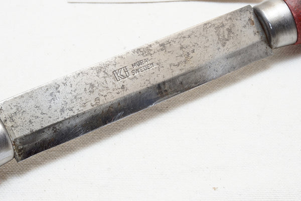 13 3/4" in total length. Stamped "KJ MORA SWEDEN" on the blade. Original red wood handles. Easily fits in a back country pack. Top quality knife.
