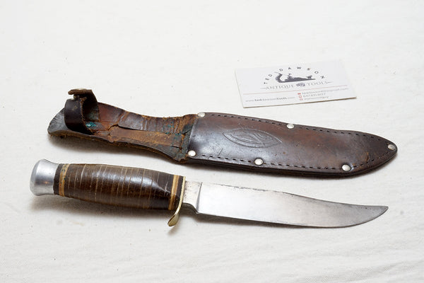 Measures 9" total length. Handle is stacked leather. The knife has been very well maintained and the blade is very clean. Nice upturned brass guard. Sheath is excellent. Quality knife.