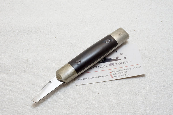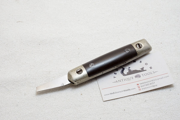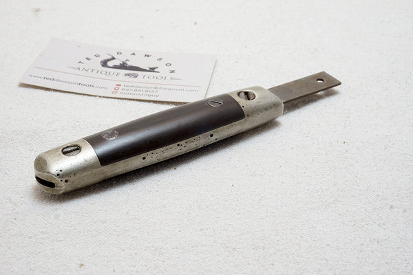 Beautiful knife in excellent condition. Found with the I P Hyde knife also listed. I do not know whether the handle is horn or ebony or something else. The metal appears to be German Silver or a very fine pewter. Again, I am not sure but it does not stick to a magnet. There is an 'H' stamped in the metal. Clearly this was a high quality knife. Blade was replaced at some point. Some casting flaws as seen.