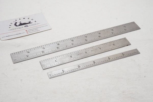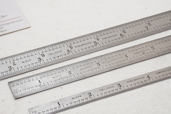 600 9" rule marked with 8ths, 16ths, 32ths, & 64ths of an inch; 600 6" marked with 8ths, 16ths, 32ths, & 64ths of an inch, and a 324 marked 32nds, & 64ths of an inch. All Starretts are in excellent condition.