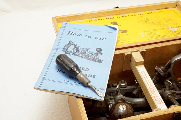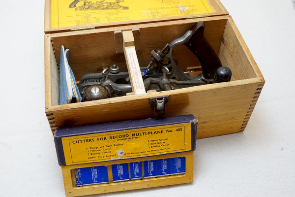 Unused or very very little used Record plow plane. Complete with cutters, depth stops, cam, screwdriver, instruction manual etc. . Slitter is in the plane as is the 1/8" beading cutter as it says on the cutter lid... A few very minor touches of light surface rust on one nut and a couple of other spots as likely stored in a humid basement. Will glow with a light cleaning.