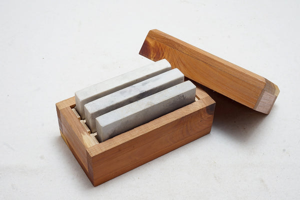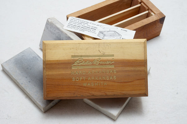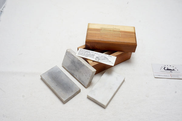 Hard, soft and washita stones. Appear to have been used just a few times. 5 x 4 x 3" cedar box. 4 x 2 x 1/2" stones. Long, long discontinued by Lee Valley and this 'EDDIE BAUER' was likely a special edition released by Lee Valley or produced for EB stores.