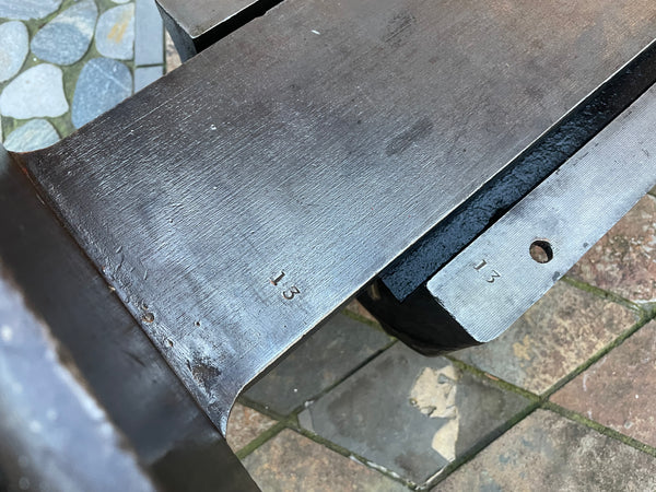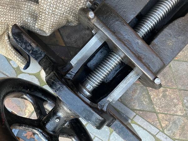 The vise is in exceptional condition and with a light cleaning and oiling I have it working perfectly (email or text me for a short video showing how smoothly it operates). It retains most of its original japanning and all the original machining marks are still visible on exposed surfaces. It includes the backing plate which are rarely ever found.