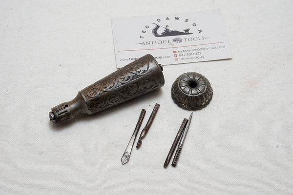 Clean and in excellent condition. Graphically stamped with 'PAT'D MAR 16 1867'. Chuck works perfectly. 4 original bits with it.