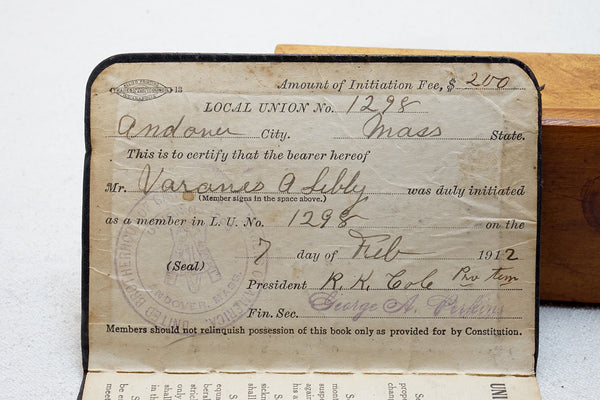 FINE JOINERS STAMP AND 1912 UNION MEMBERSHIP BOOKLET - V.A. LIBBY, ANDOVER MA