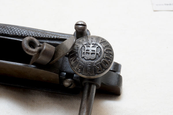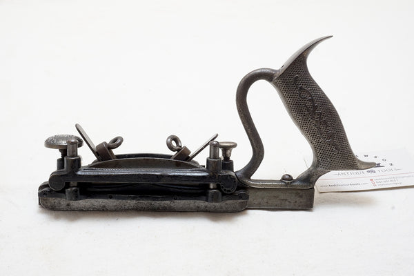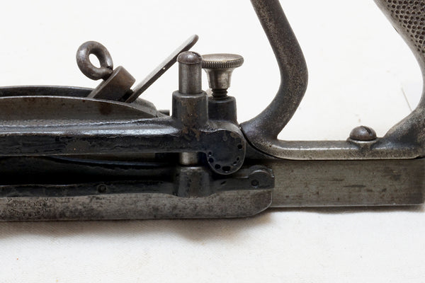 Stunning design. Very decorative front knob and locking screw. Front and back fence locking screws both fine. Name and patent date on the fence. Excellent as found condition noting only what appears to be a repair at the rod opening on the back end. Hard to say if it is a poor casting or a repair but selling as though repaired.