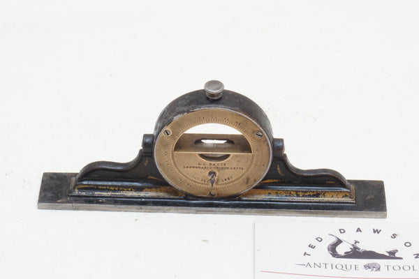 Early version stamped LL DAVIS ADJUSTABLE SPIRIT LEVEL PAT. SEPT. 17 1867'. 90% plus japanning plus gold trim and decorative highlights. Very clean brass face, pointer and screws. The level base has a repaired crack and there is a small rough area in the main casting at around "11 o'clock". Nonetheless a great looking example.