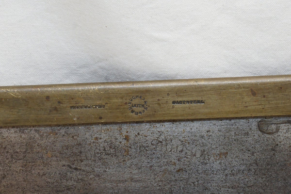 Heavy brass back with a 14" cutting edge. HUGHES & HUDSON LEITH stamped on the back. NOT listed in Simon Barley's incredible work on British sawmakers although an Edwin Hughes from Leith is listed ca 1880 as a sawmaker. Good etch is visible and should pop with a cleaning. Will be a great miter or tenon saw or for use with large dovetails. Will make an excellent user.