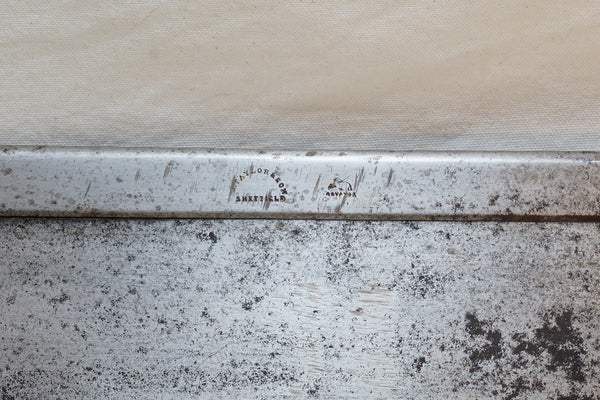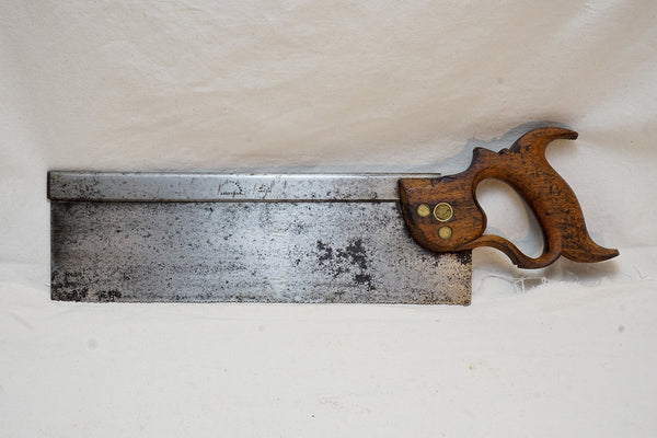 Steel back is stamped "J TAYLOR & SON SHEFFIELD ADVANCE". 12" cutting edge. This exact logo is CA 1840 as per Simon Barley's outstanding book on British sawmakers and also has the 'ADVANCE' logo. Fine very small nuts.