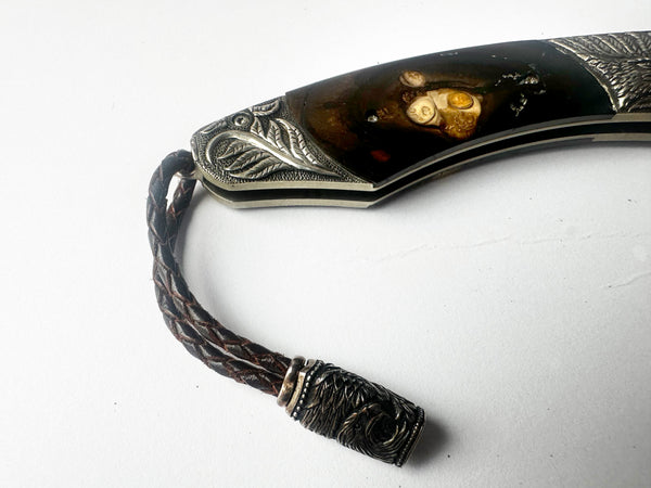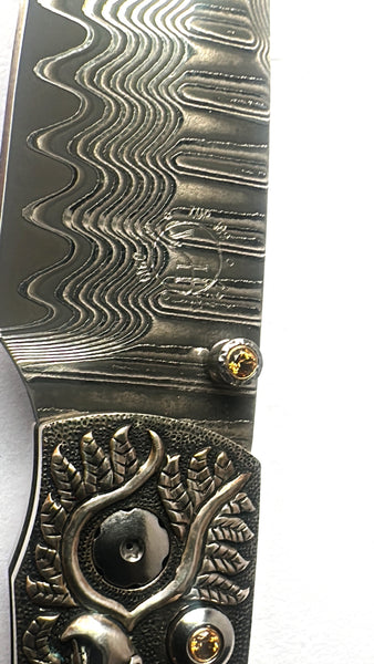 The frame is hand-carved sterling silver inlaid with 10,000-year-old fossilized Woolly Mammoth tusk. The blade is crafted from 'wave' damascus steel with a core of ZDP-189 steel. Additional features include citrine stones on the lock and thumb stud, along with a sterling silver lanyard bead. One hand push button lock.